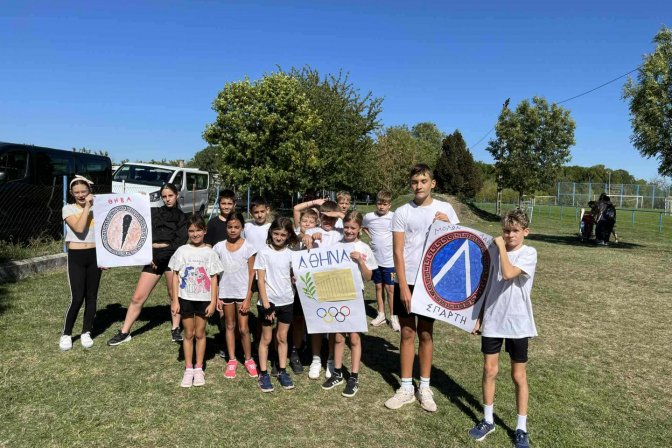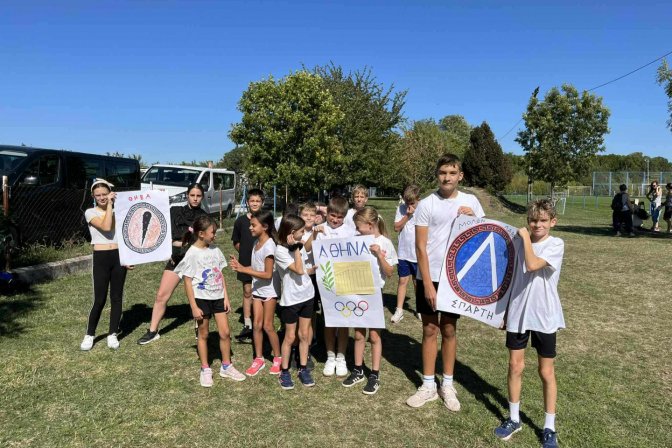 A legnagyobbak, a 13–14 évesek (fiúk és lányok vegyesen) vettek részt ebben a kihívást jelentő számban, ahol terepfutás és gyors rajt is várt rájuk. Igazi próbatétel volt – és kiválóan helytálltak! A váltófutásnál természetesen nem maradhat el a σκυτάλη – az a rövid, bot formájú tárgy, amit mindenki ismer a stafétából.